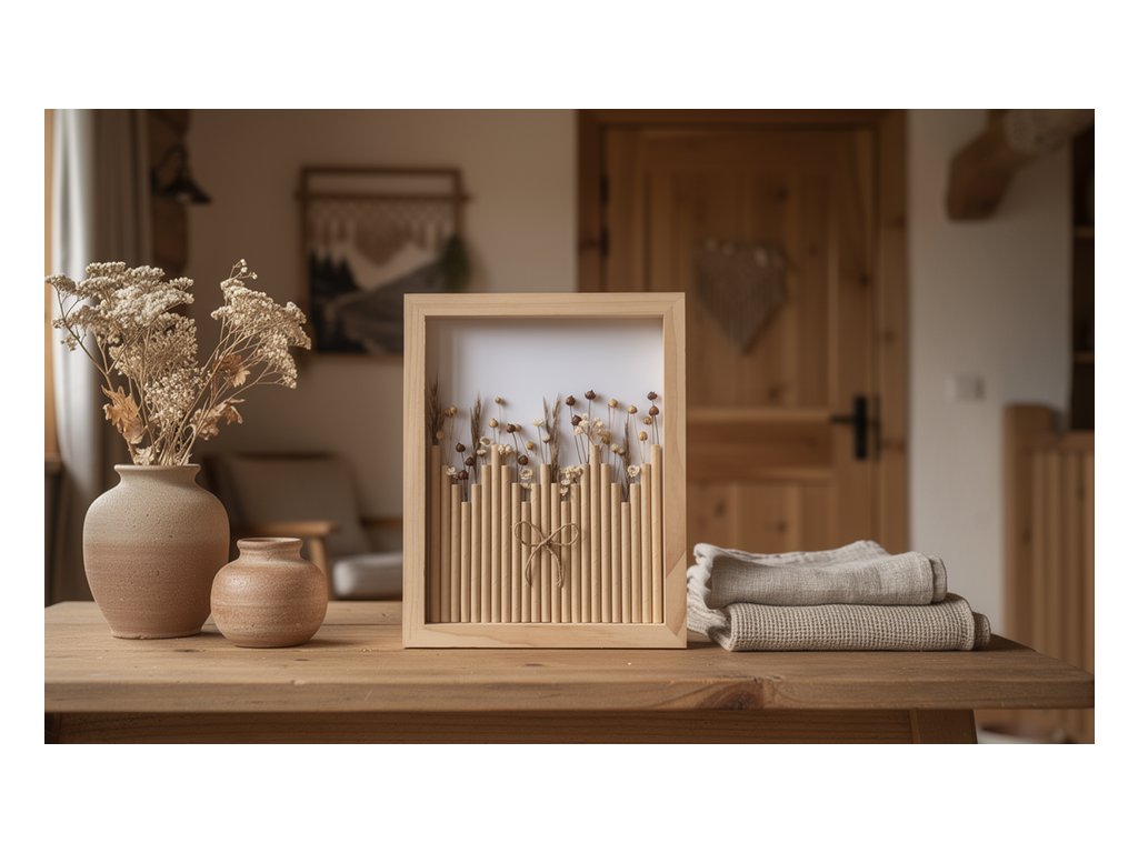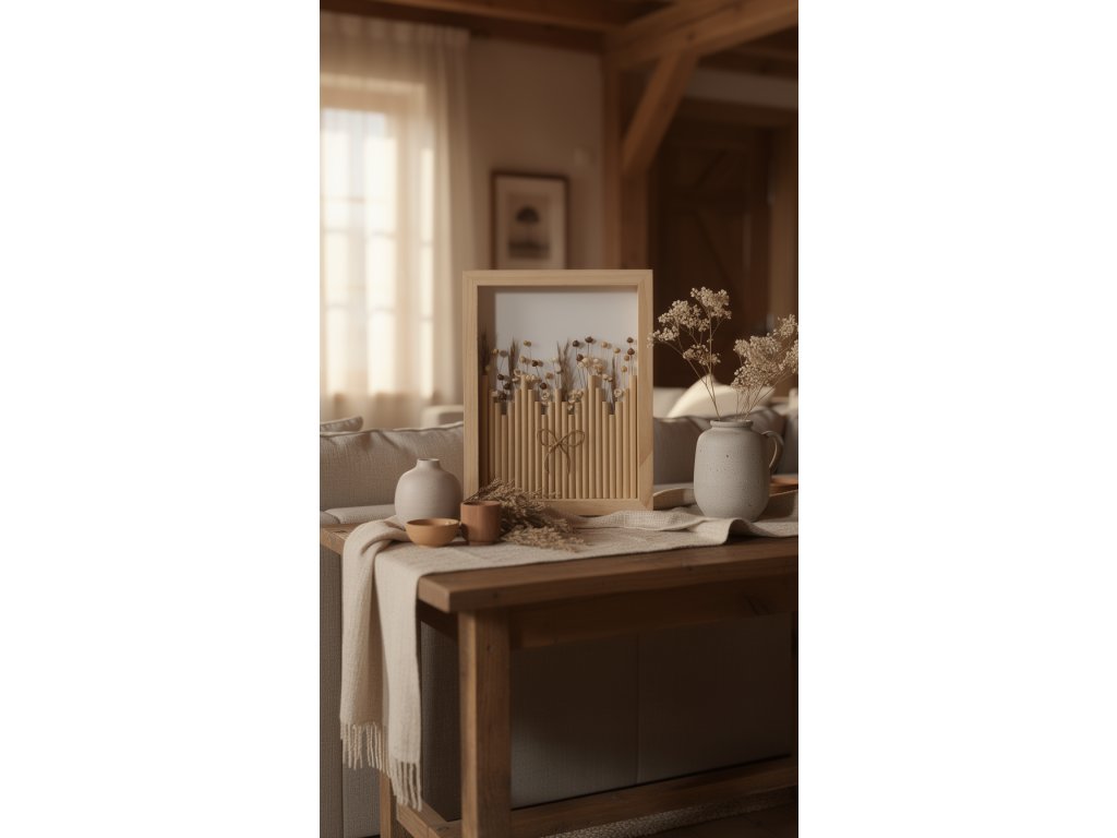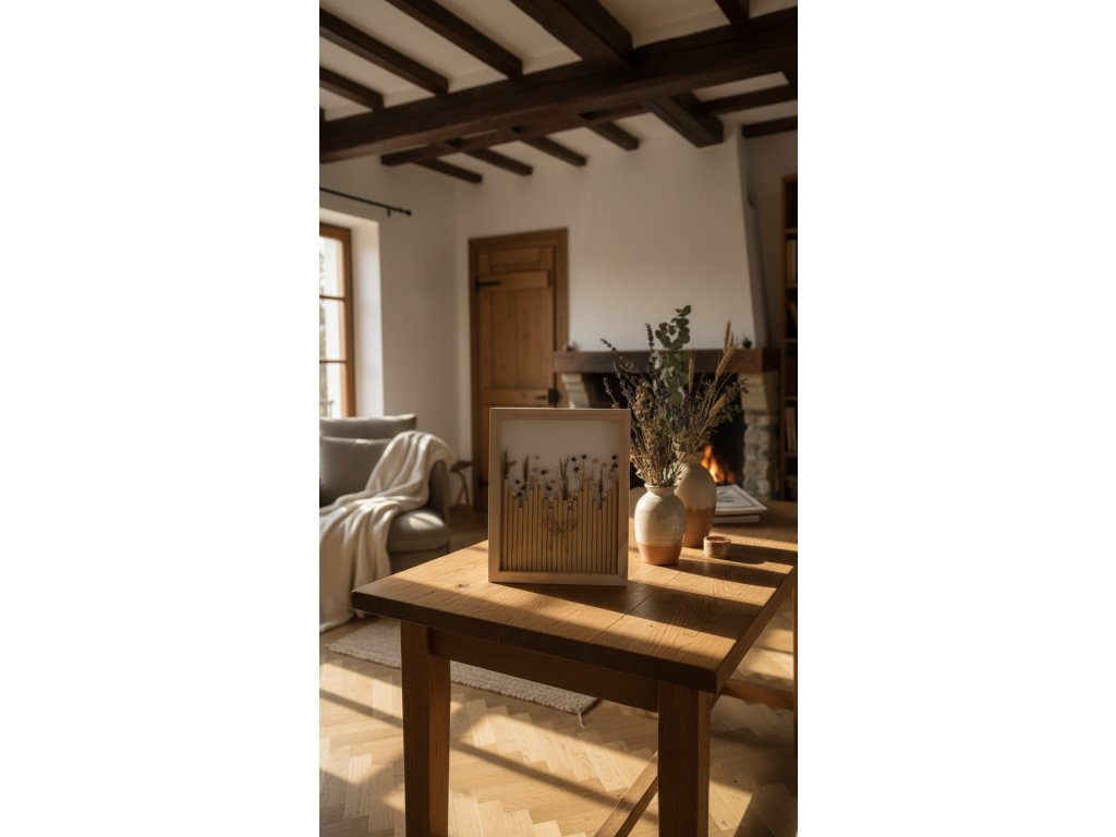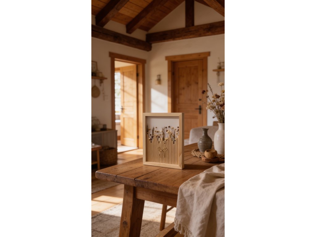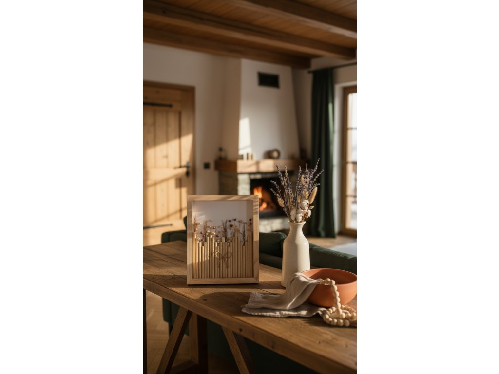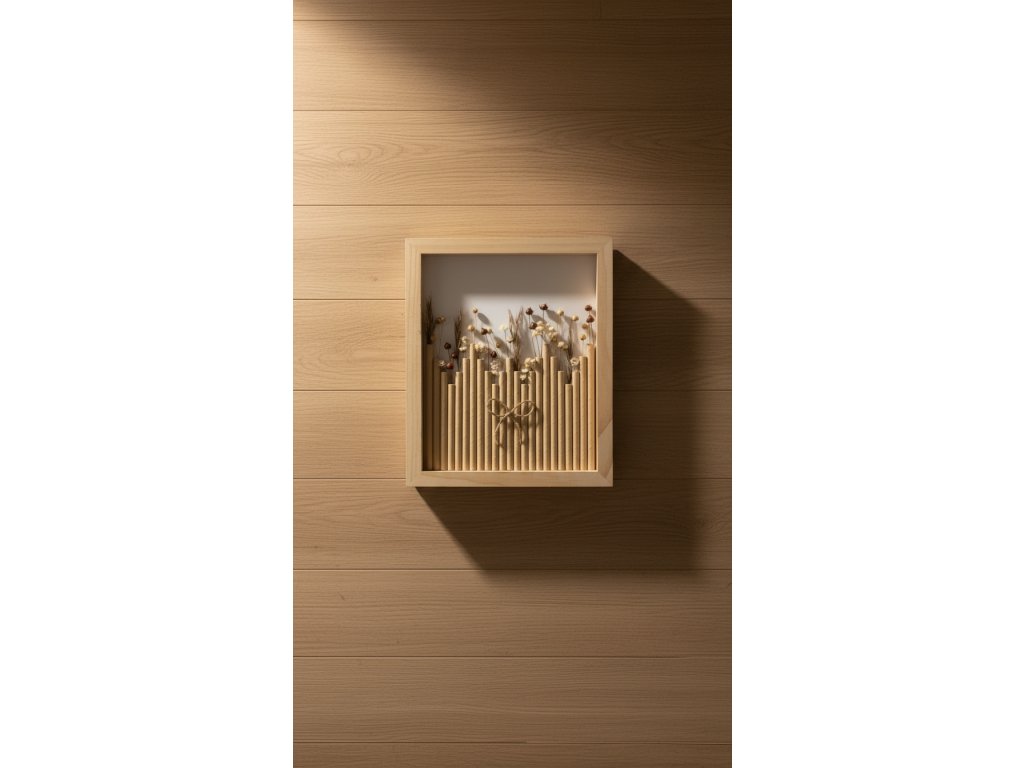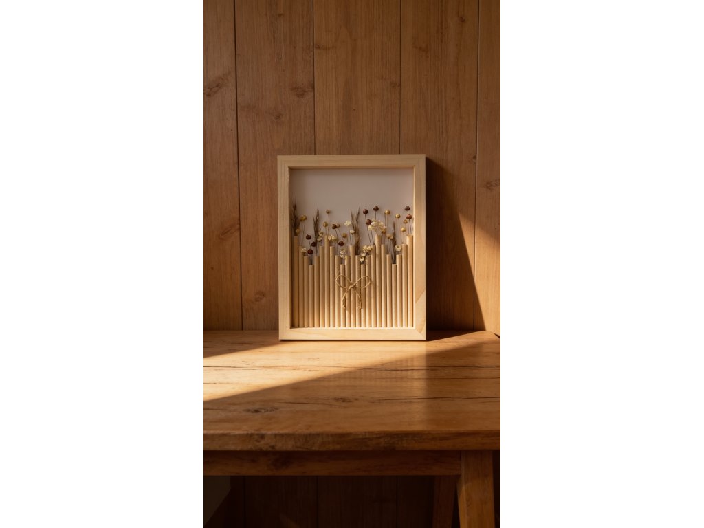 Dřevěný stín je unikátní květinový obraz o rozměru 23 × 28 cm, jehož rám je vyroben z přírodního dřeva. Teplé, zemitě hnědé tóny a jemná kresba letokruhů vytvářejí hluboký, uklidňující vizuální efekt.